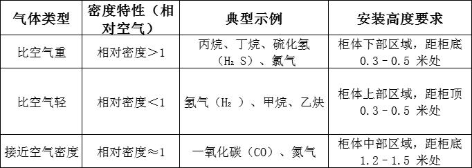 不同氣體因密度差異,泄漏后會呈現“下沉”或“上浮”的擴散規律,這是安裝位置的首要依據,需優先判斷氣體類型: